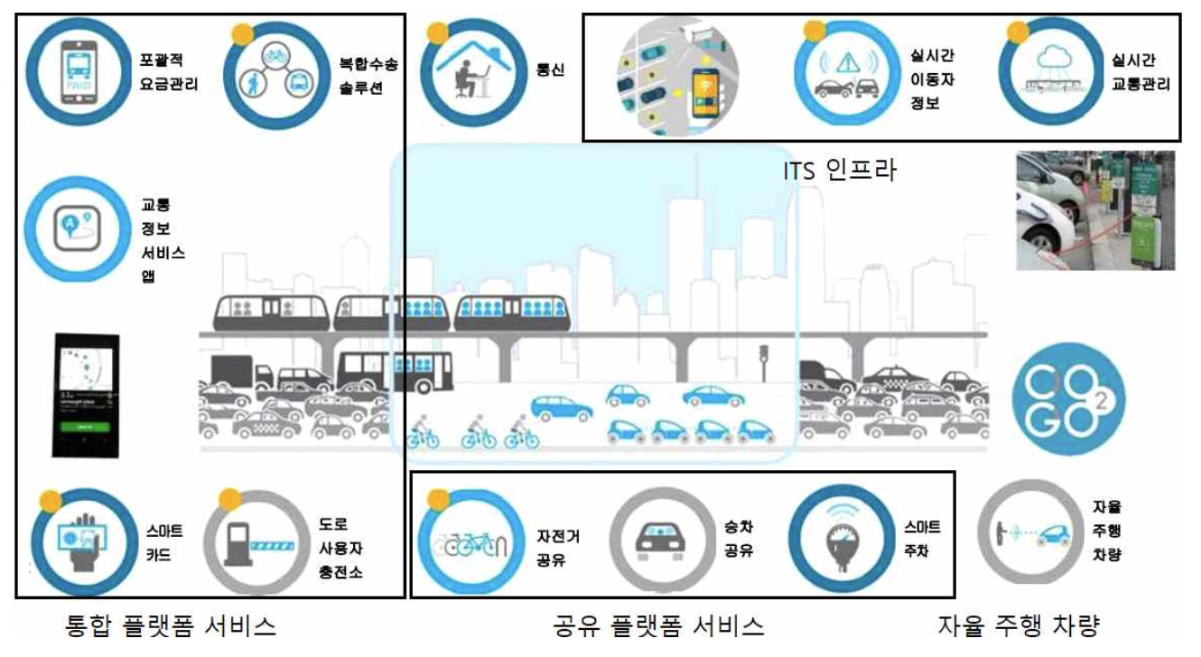 스마트 모빌리티는 기존의 교통시스템에 다양한 융복합 기술을 응용하여 1) 자율주행과 같은 커넥티드 카 서비스, 2) 사물 인터넷 (IoT) 센서와 빅데이터 서비스를 활용한 지능형 교통 시스템 (ITS, Intelligent Transportation System) 같은 인프라 서비스, 3) 모빌리티 장치의 통합 공유 플랫폼과 같은 MaaS (Mobility as a Services)를 제공한다.