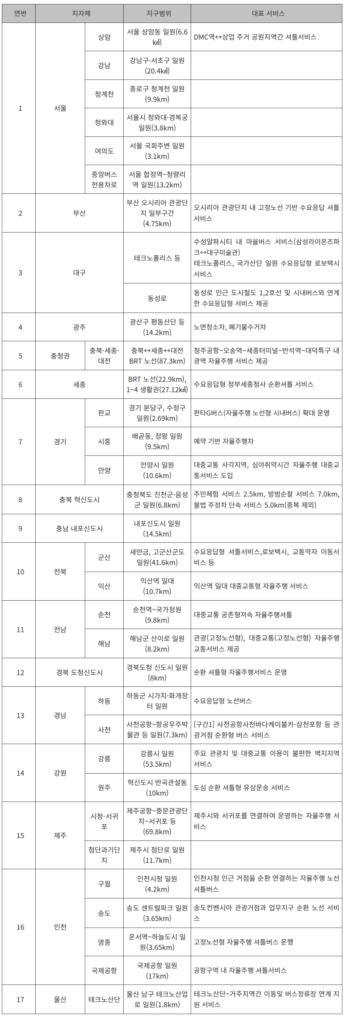 자율주행자동차 시범운행지구별 도입서비스 및 범위(2023.12월 기준)