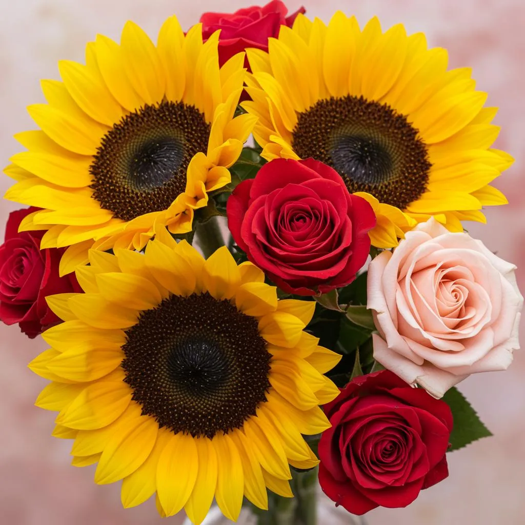 "Wishing you a very Happy Birthday! May your life continue to be a bouquet filled with the vibrant joy of sunflowers, the passionate love of red roses, and the tender sweetness of blush pink roses. May each petal of this day unfold with happiness and blessings."