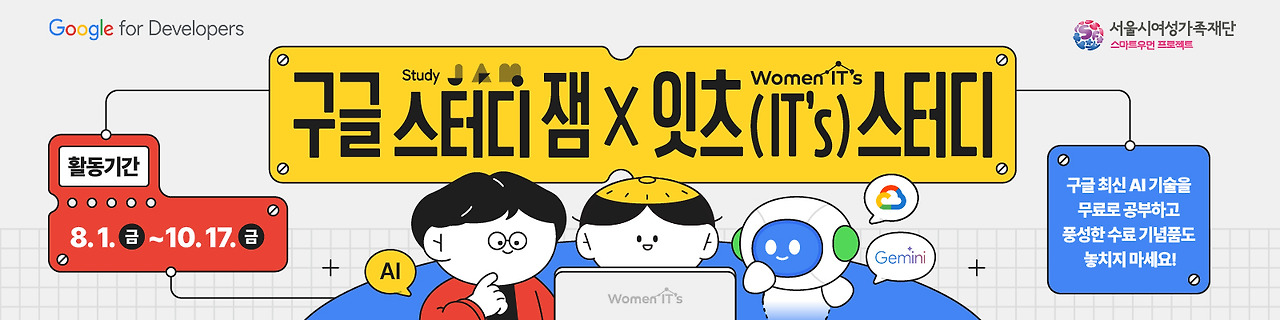 지난 우먼 잇츠 스터디 3기에 이어 4기 스터디도 신청하게 되었다. 이번에는 구글 스터디 잼 프로그램을 통해 온라인으로 Gemini, Vertex AI, 생성형 AI를 공부하고 Google Cloud를 학습하려고 한다.