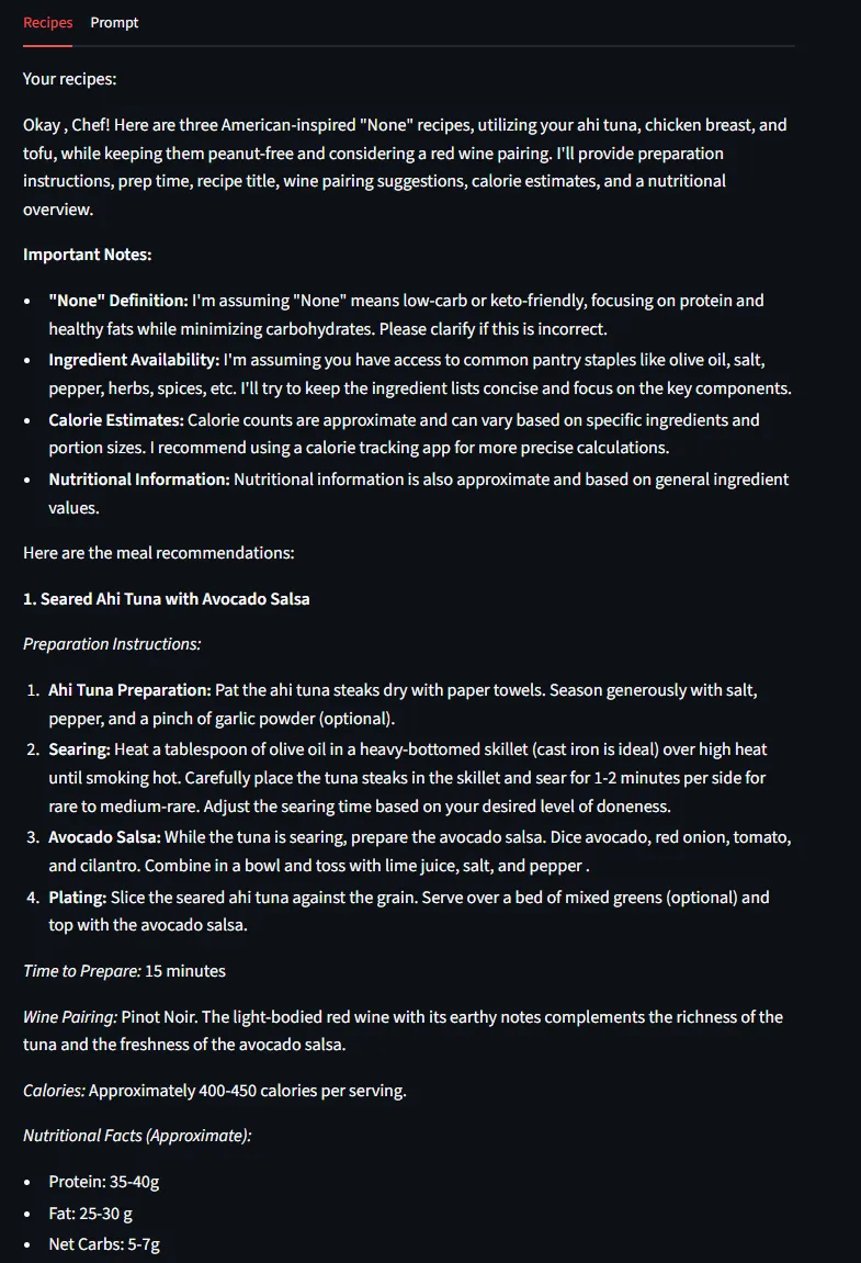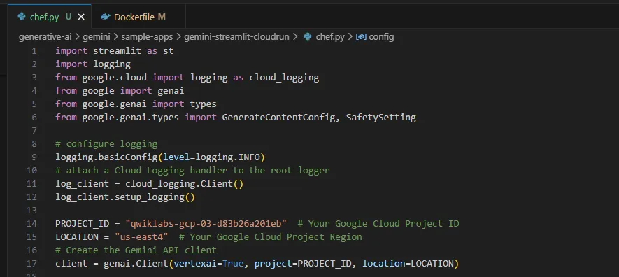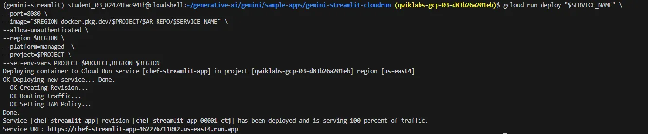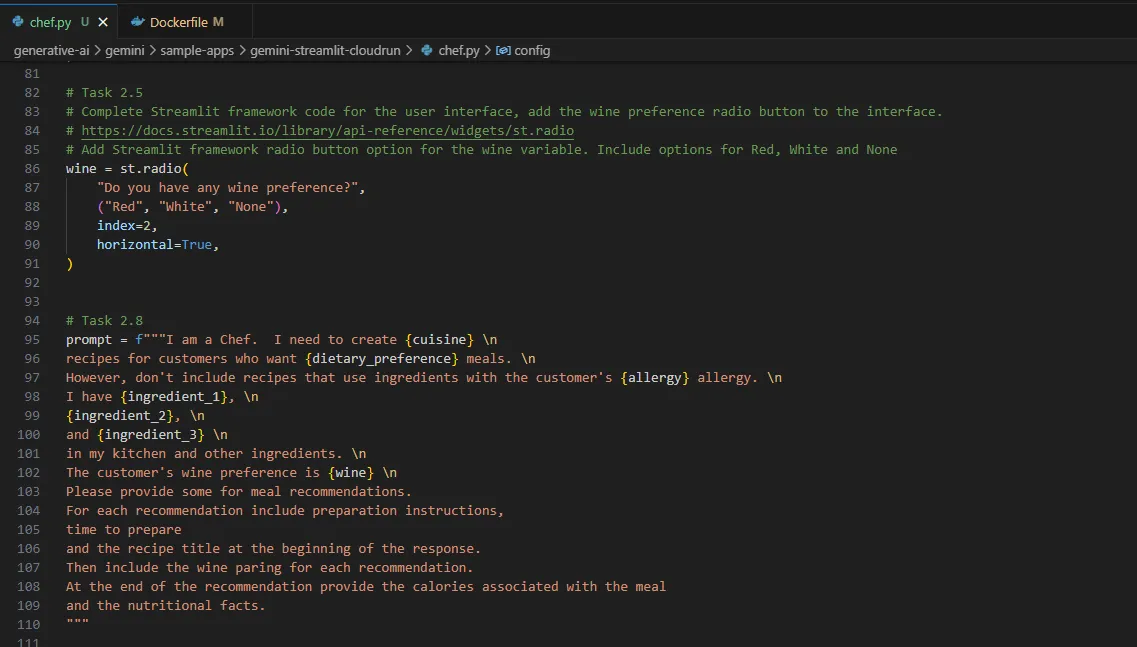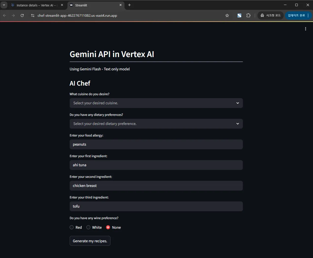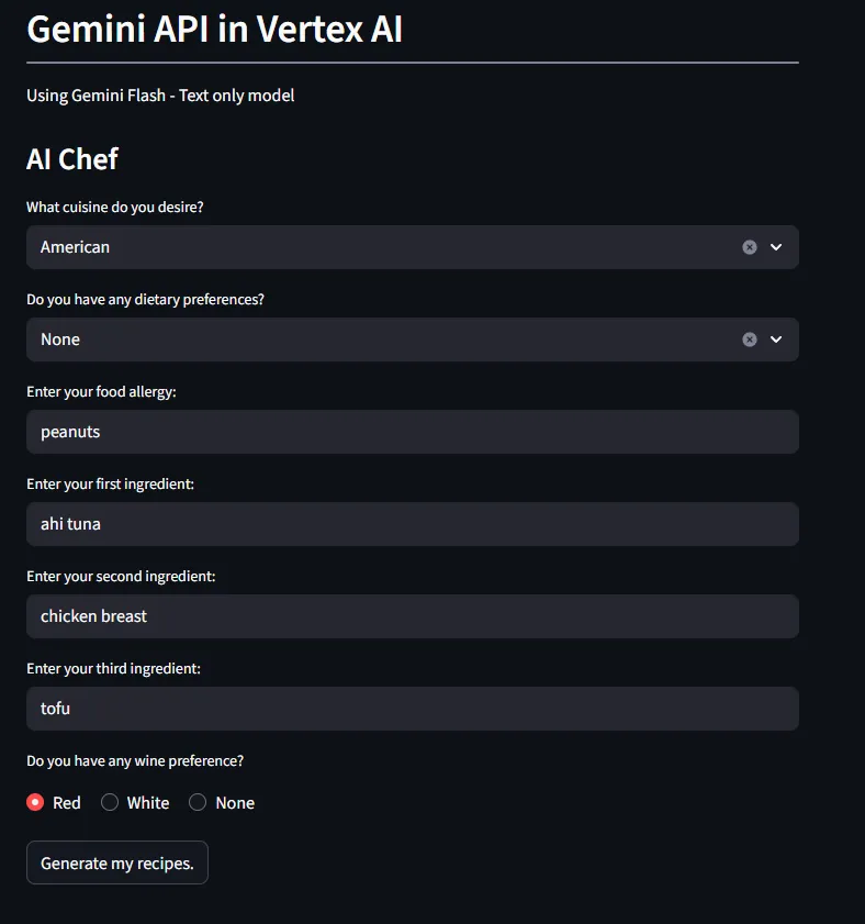 해당 과정의 챌린지 실습으로 텍스트, 오디오, 이미지, 동영상을 생성하는 멀티모달 모델인 Gemini의 기능을 활용하여 고객을 위한 식단 추천을 생성하는 애플리케이션을 빌드해야 한다. 고객의 음식 선호도, 식이 제한사항, 식품 알레르기, 주로 집에 있는 재료 또는 식료품점에서 구매할 수 있는 재료를 기반으로 레시피를 생성하는 AI 기반 셰프 앱을 만든다고 가정을 하고, Gemini 모델, Streamlit 프레임워크, Cloud Run을 기반으로 빌드된 이 셰프 앱의 개념 증명(PoC)을 빌드, 테스트, 배포해야한다.