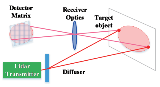 디지털 카메라와 유사한 작동방식으로, 단일 대면적 레이저 펄스가 그 앞의 환경을 비추고 레이저에 근접하게 배치된 광 검출기에서 거리, 위치 및 반사 강도를 감지하는 방식