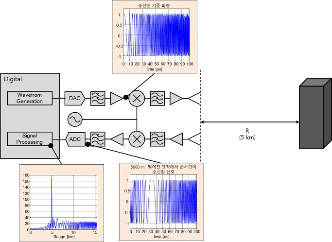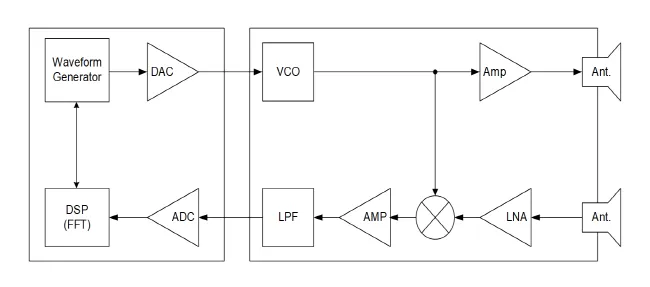 전압제어형 오실레이터(voltage-controlled oscillator, VCO)로 FM 신호를 만들고, 송신기와 수신기의 간섭을 최소화하기 위해 두 개의 안테나가 설치된 경우, Digital 단에서 Chirp 파형이 신호처리적으로 생성되거나 메모리에 저장된 해당값이 DAC를 통해 아날로그로 변환된다. DA의 sampling rate에 따라 다양한 harmonic 성분을 갖기 때문에 이를 제거하기 위해 LPF(Low Pass Filter)를 거친다. 적절히 증폭된 뒤 Carrier 주파수에 실어준다. 원치 않는 신호를 제거하기 위해 BFP (Band Pass Filter)를 거친 후 증폭되어 해당 신호는 안테나를 통해 전송된다. 표적에 반사된 신호는 수신 안테나를 통해 획득한다. 신호는 적절히 증폭된 뒤 Carrier 주파수가 제거된 뒤 filtering을 거쳐 디지털로 변환되어 표적의 거리를 알 수 있도록 하는 신호처리(FFT)를 거친다.