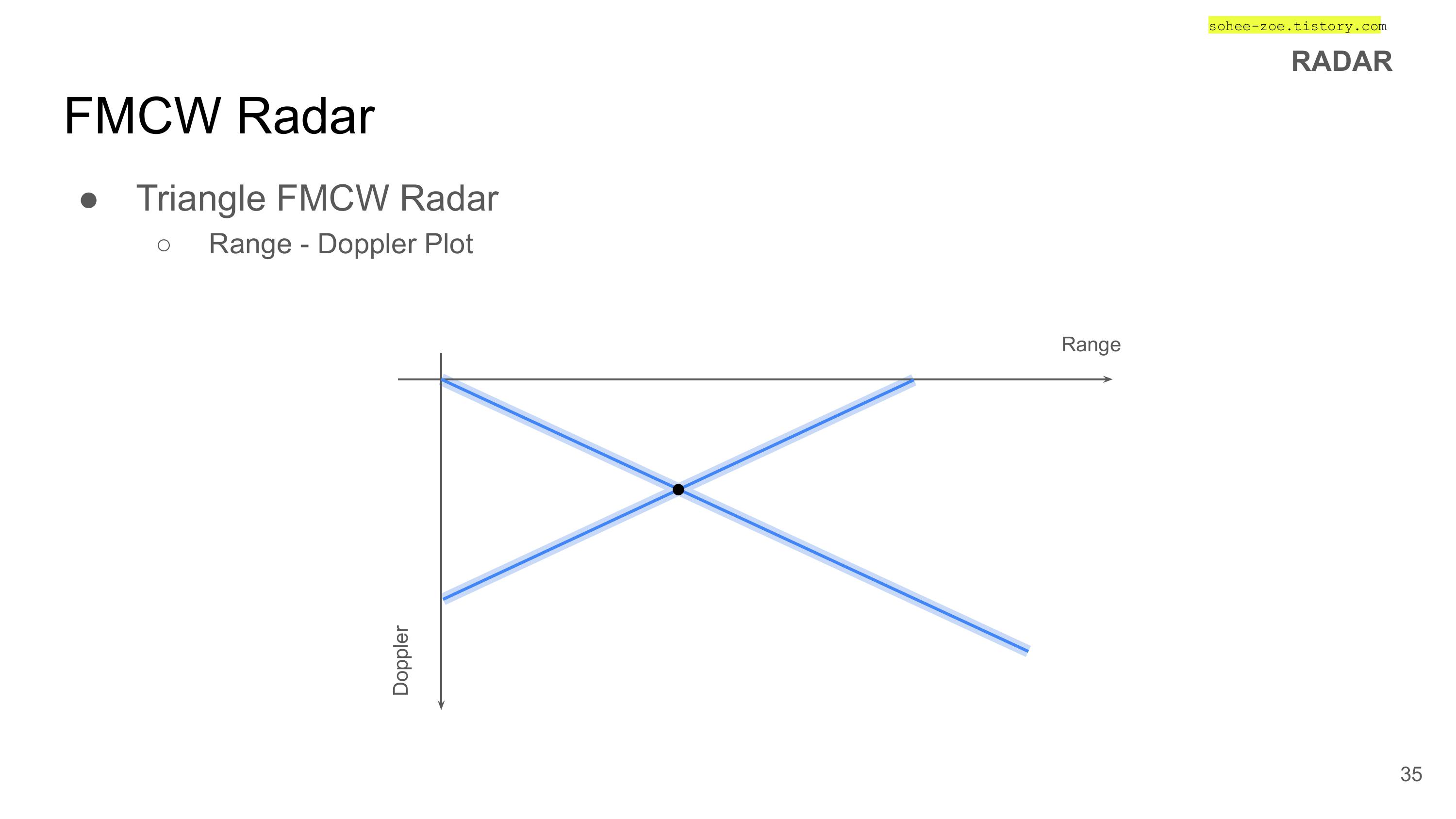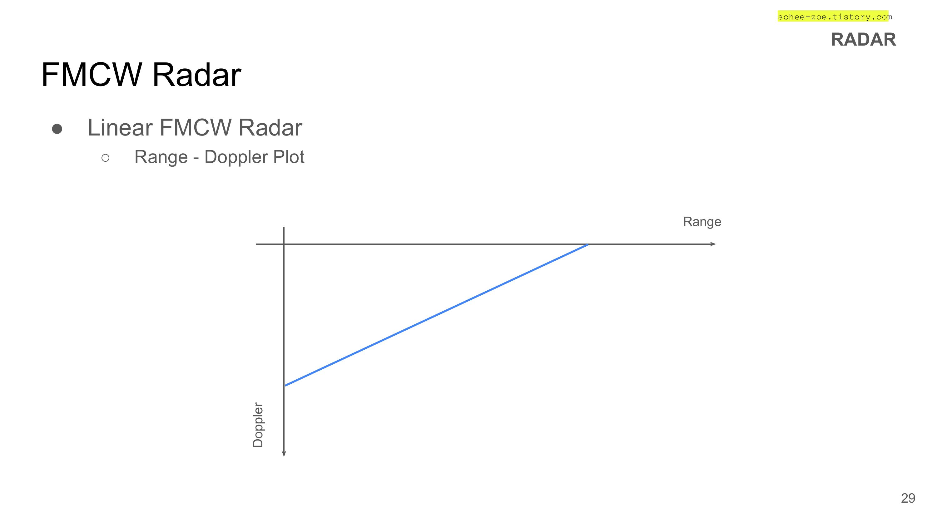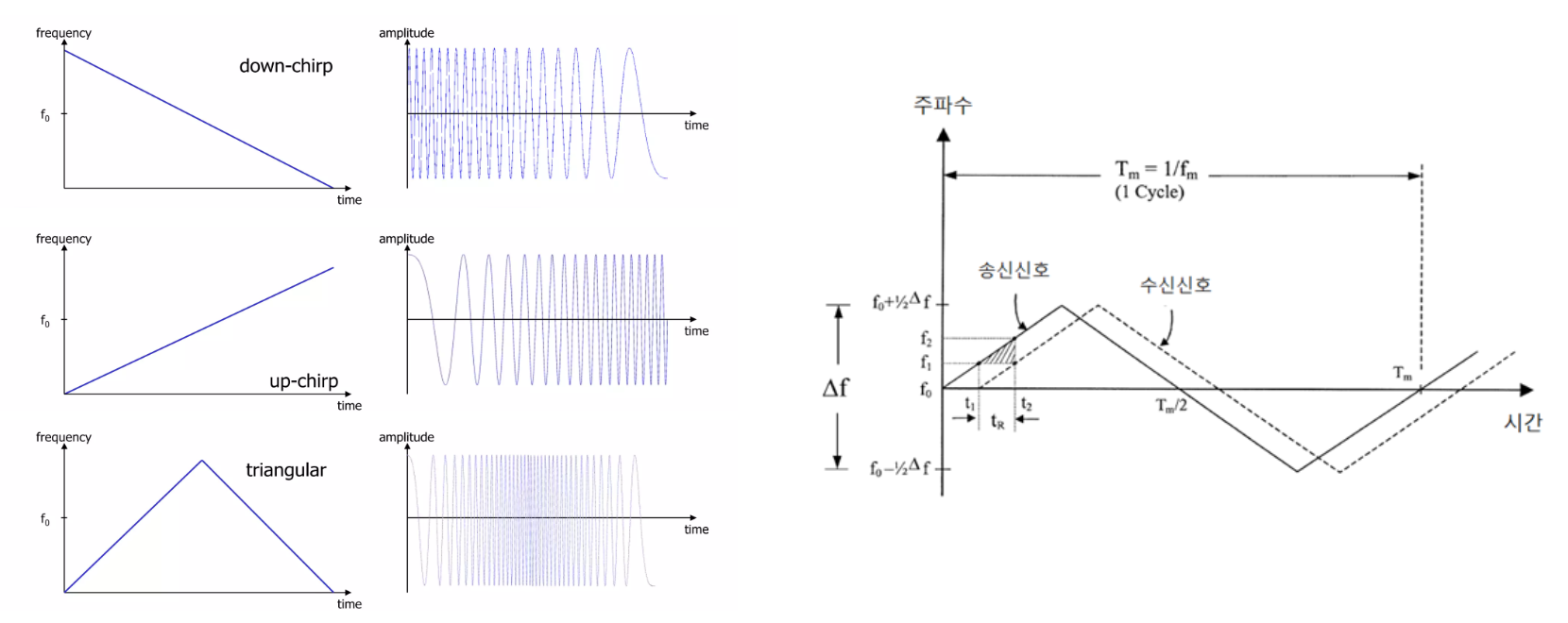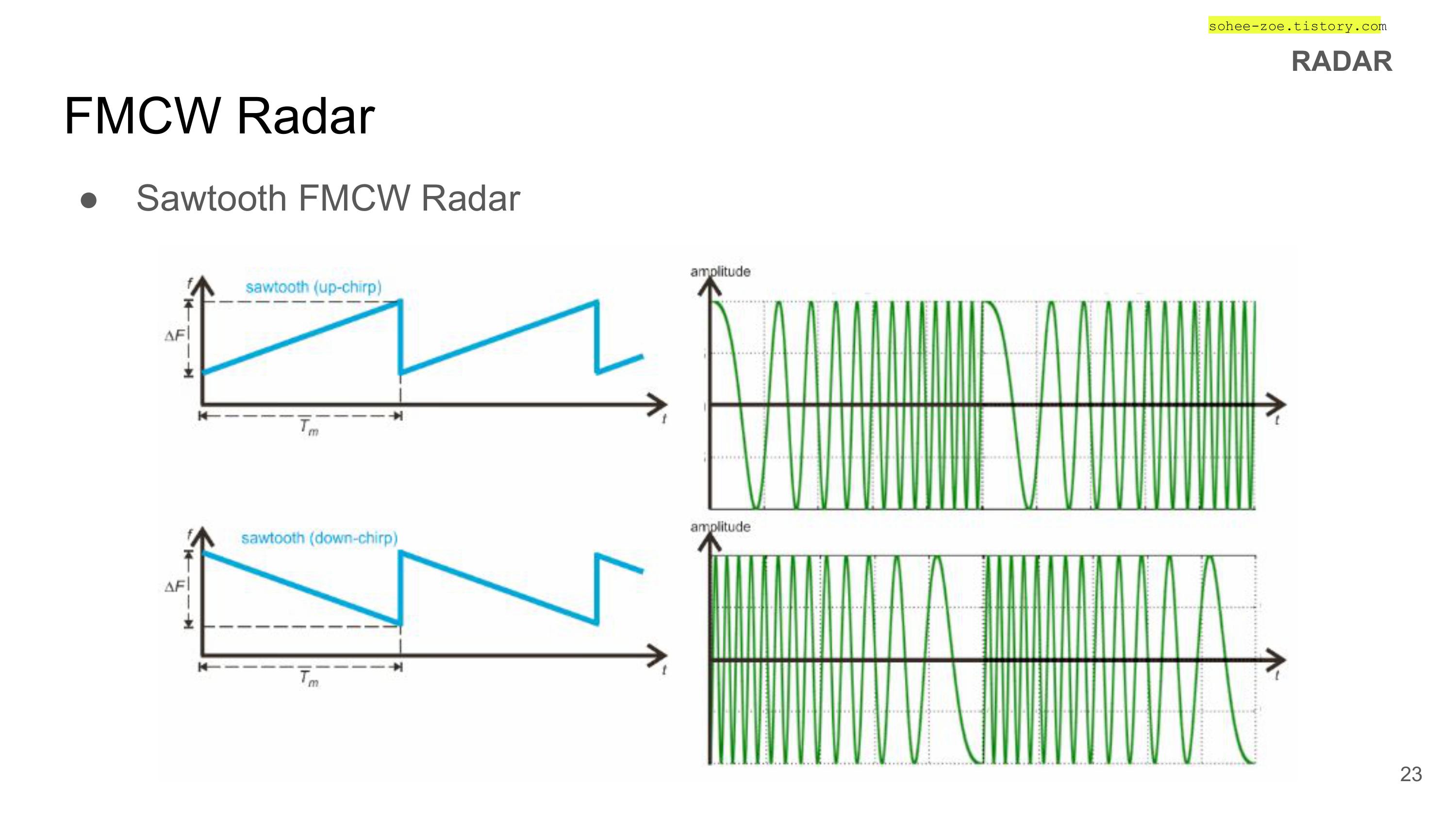 - 주파수 변조된 신호(FM chirp signal)을 연속적으로 발사하는 방식의 레이더
