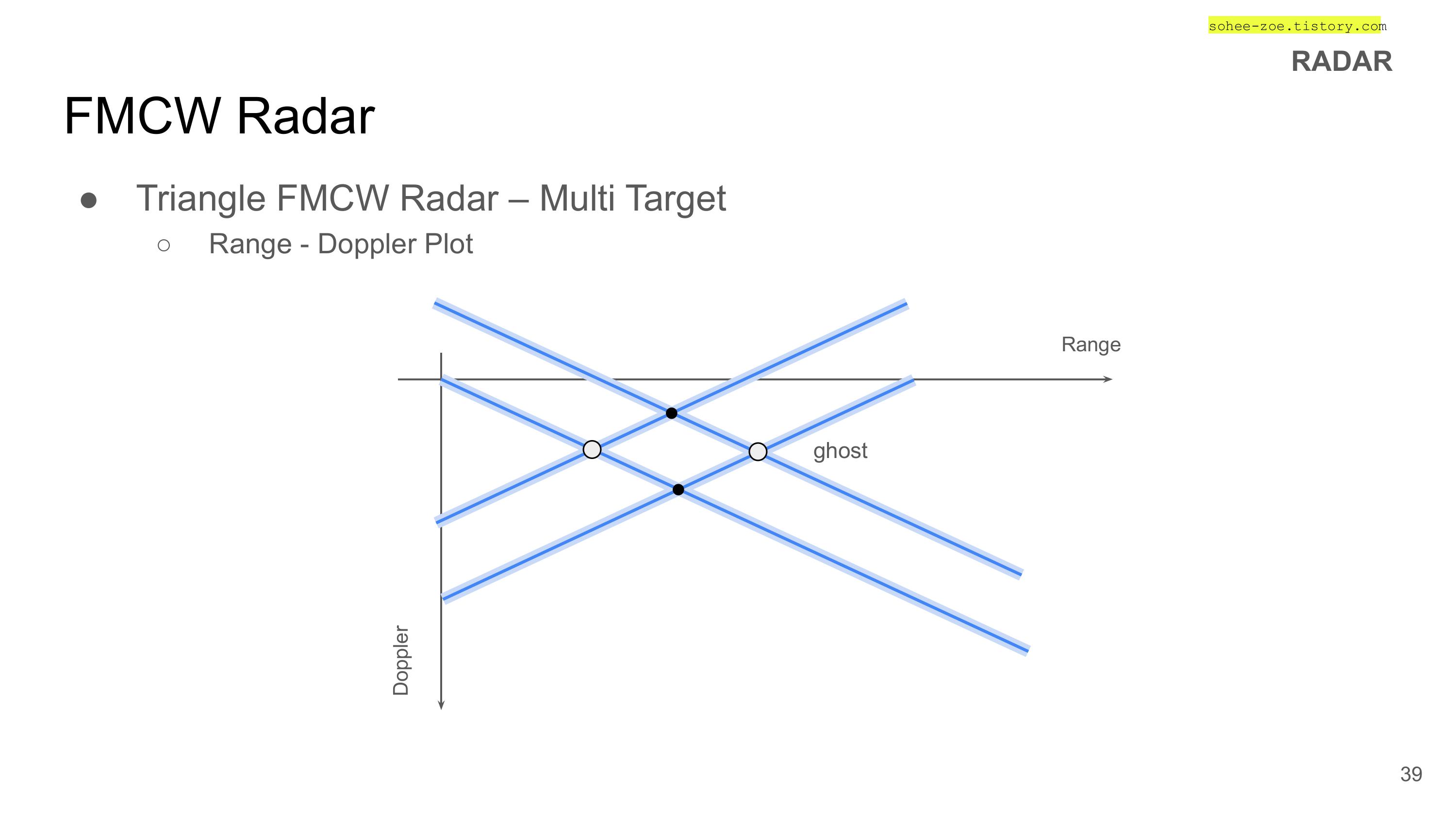 - RADAR Beam 선상으로 직접 멀어지는 것이 아니기 때문에 실제 속도를 알 수 없다. 빔과 표적 움직임 사이의 각도에 의해 상대 속도 측정