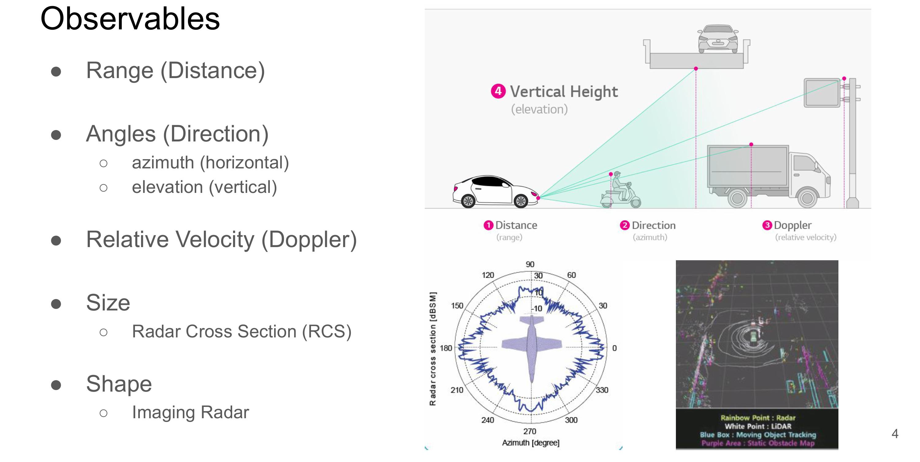 - 상대 속도 및 이동방향: 돌아온 전파의 파장 변이 (도플러 효과에 의한 주파수 편이 측정)