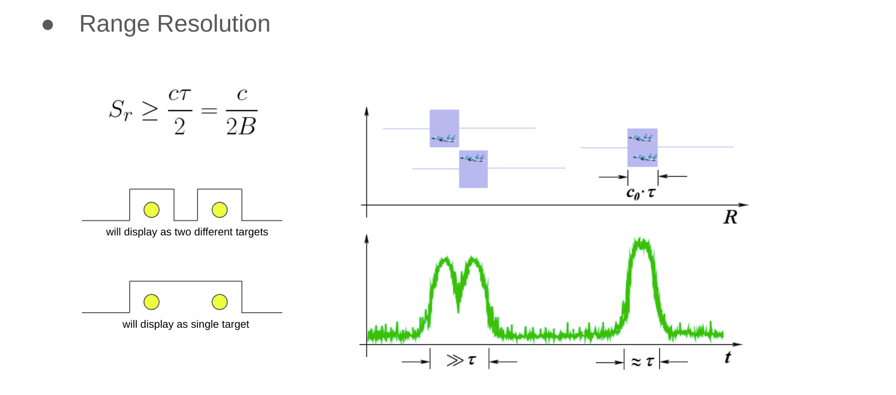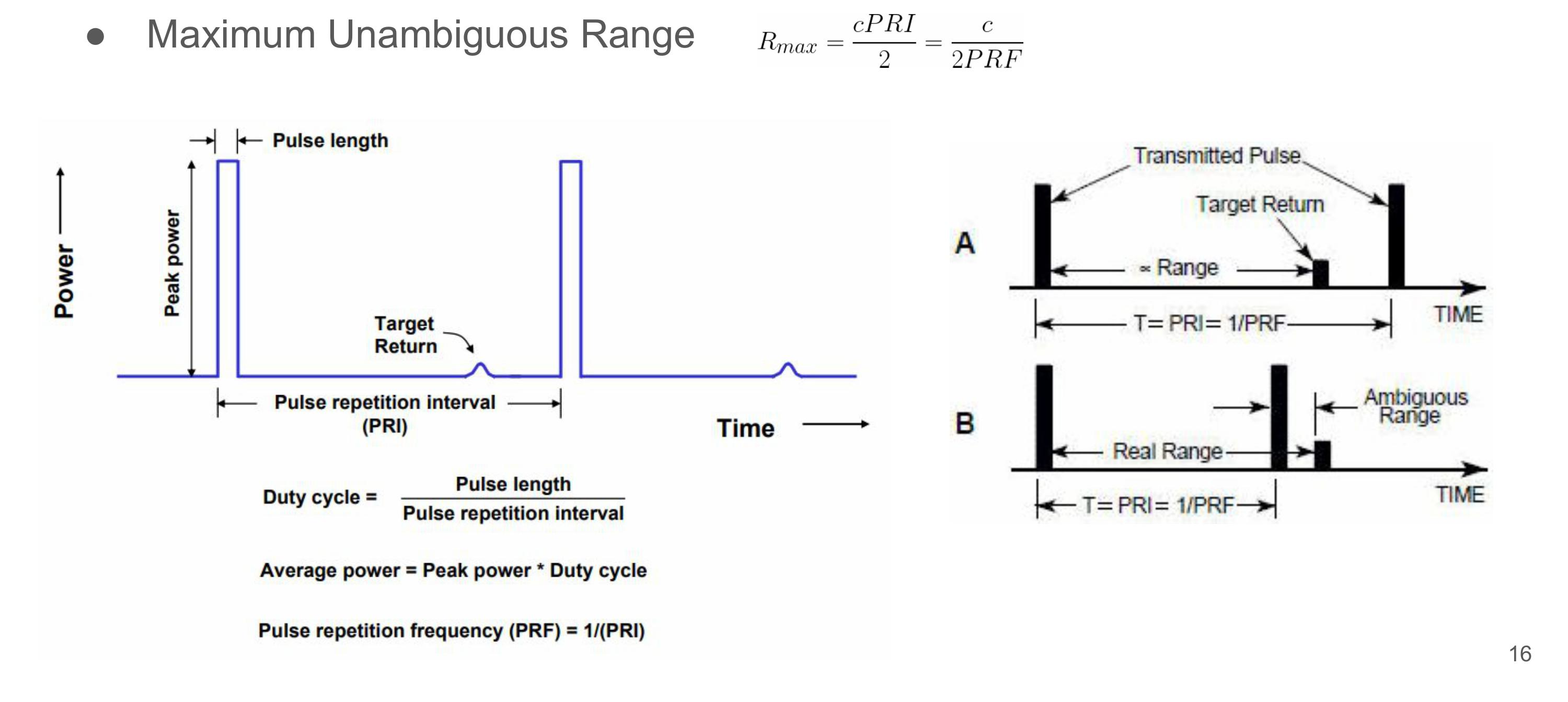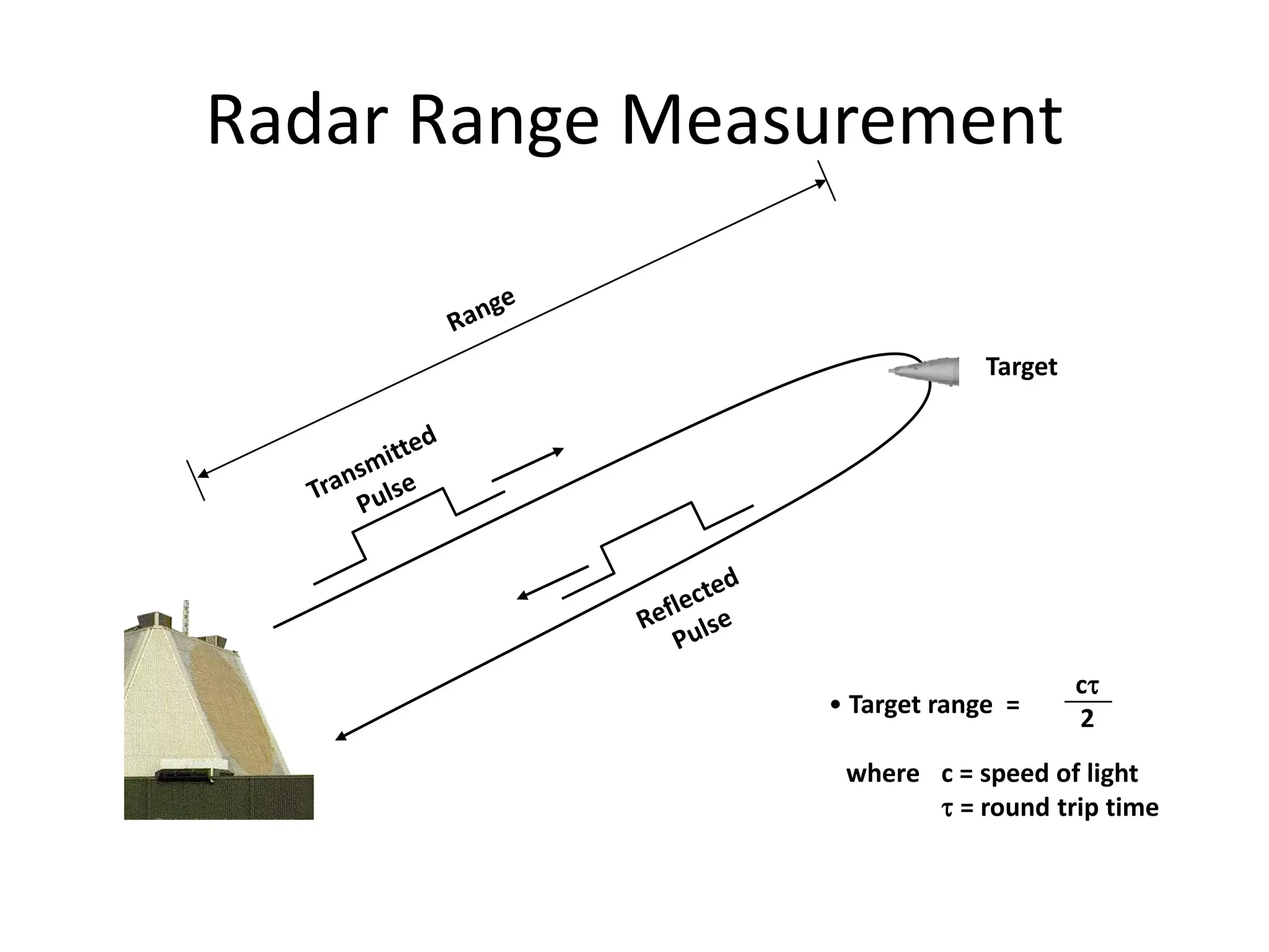 - 각 펄스의 폭은 $ \tau $이고, 반복 주기는 $ T_p = 1 / f_p $이며, $ f_p $는 펄스 반복 주파수이다. 송신된 펄스는 목표물을 맞은 후 거리에 따라 다르지만 일정 시간 $ t_R $ 후에 레이더로 되돌아온다. 여기서 $ t_R $은 펄스 마이크로웨이브 신호의 왕복 이동시간이다. 따라서 목표물 거리는 빛의 속도 $ c $를 이용해서 계산할 수 있다.