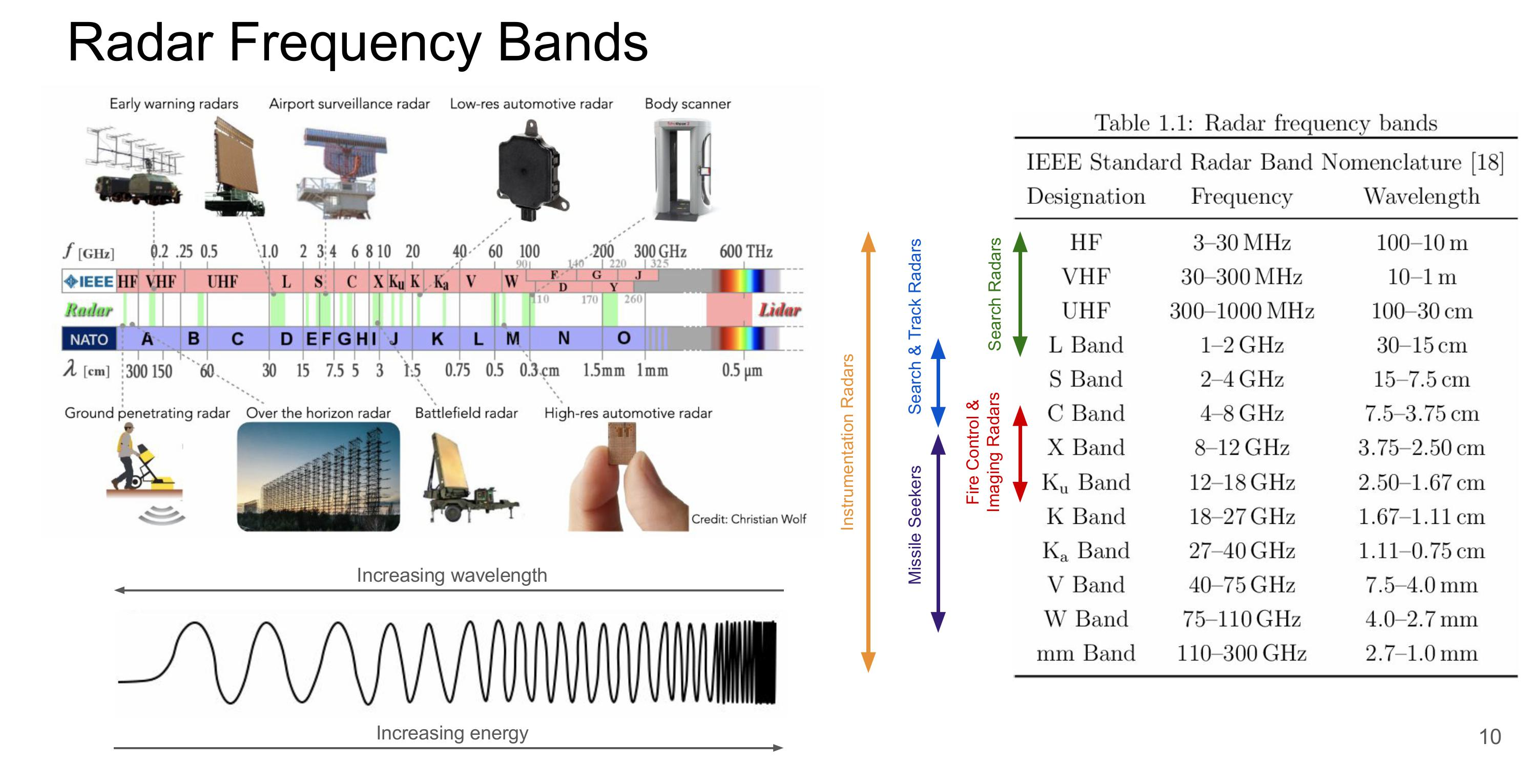 주파수는 `10~140Ghz` 까지 폭 넓게 사용 가능하고, 응용 분야에 따라 최적의 레이더 대역을 선택하기 위해 솔루션 사전 성능 비교 검토가 필요하다. 차량의 경우 `60, 77, 79Ghz`를 사용하며, 보안 조명의 경우 `24GHz`를, 바이오의 경우 `10GHz`를 사용한다. 가전 로봇의 경우 `60GHz`를 사용한다.