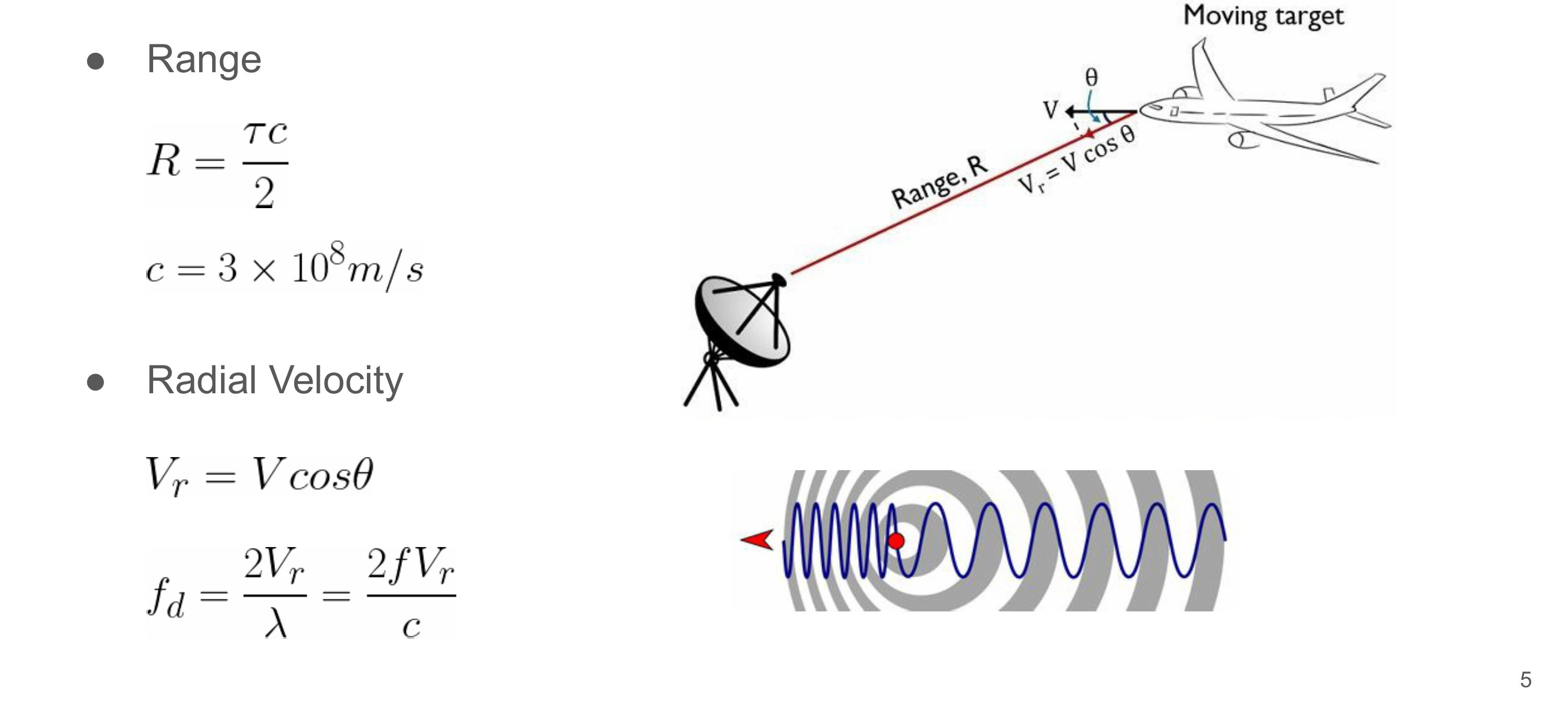 $$ R=\frac{c \cdot \Delta t}{2} \qquad v=\frac{\lambda \cdot f_d}{cos\theta} $$