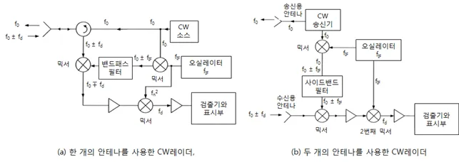 - 송신신호가 휴지시간 없이 지속적으로 발사되는 레이더 (신호를 받는 도중에도 송신기 동작)