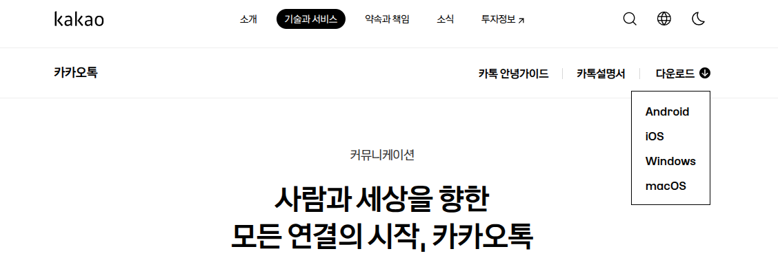 https://www.kakaocorp.com/page/service/service/KakaoTalk 페이지에서 `다운로드 - Windows`를 통해 설치 파일(exe)을 다운받는다.
