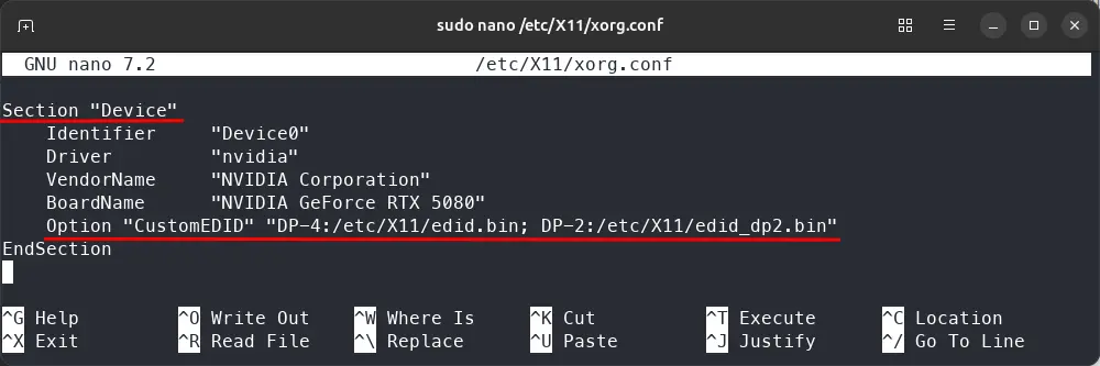 Option "CustomEDID" "DP-4:/etc/X11/edid.bin; DP-2:/etc/X11/edid_dp2.bin"