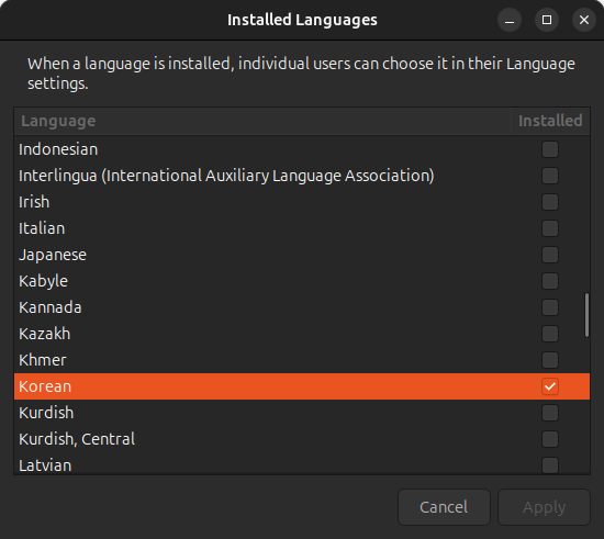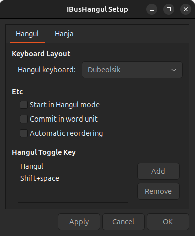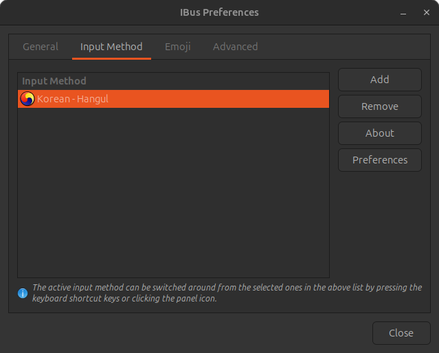 Input Method - Add - `Korean-Hangul` 추가 (꼭 Hangul이 있는 걸로 선택해야 한다.)