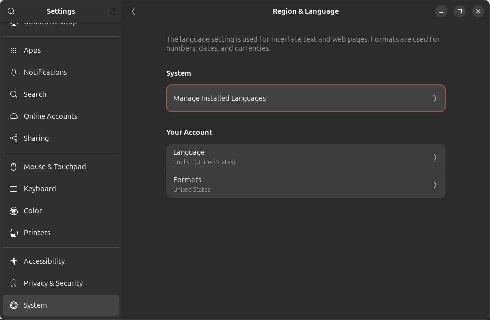 Settings - System - Region & Language - Manage Installed Languages