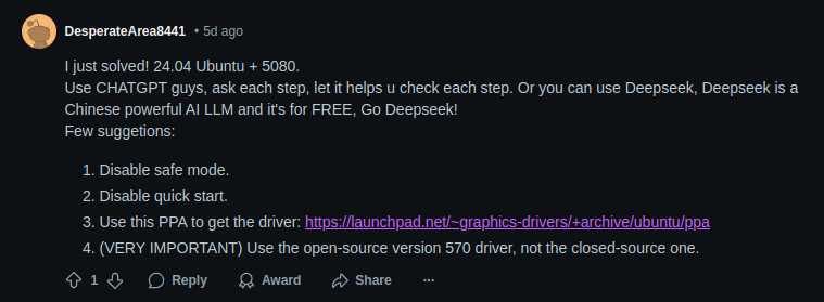 나의 경우 nvidia-driver-570, CUDA 툴킷을 통한 설치 모두 NVIDIA 드라이버 설치가 제대로 되지 않았다.
